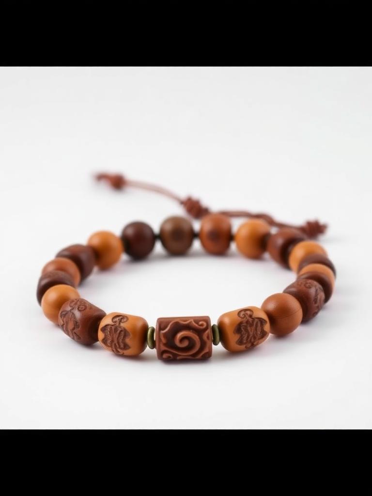 Pulsera elástica hecha a mano con cuentas de madera talladas con motivos tribales polinésicos. Cómoda, resistente y con un estilo artesanal único.
