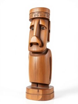 Escultura artesanal tallada a mano en madera nativa, representando la figura tradicional Moai de la cultura Rapa Nui. Su acabado fino y natural la convierte en una pieza ideal para decoración o colección.